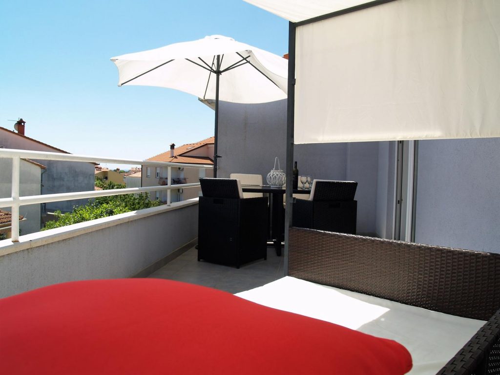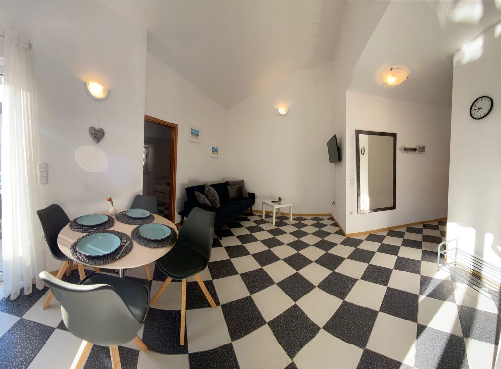 Das sehr geräumige Wohnzimmer ist in mit einer gemütlichen Couch und einem Flachbildfernseher ausgestattet. Die großzügig eingerichtete Küche mit separater Essecke lässt keine Wünsche offen. Das besondere Highlight dieses Apartments ist der riesige Balkon mit Meerblick und gemütlichen Sonnenliegen, und zwei Markisen der zum Genießen, Träumen und Entspannen anregt.